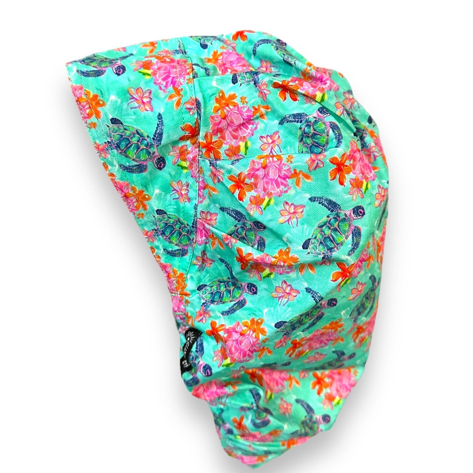 Tie-Back: A unisex surgical scrub cap that offers a little more room than our classic cap. Short-medium length hair can be tucked in for full coverage or worn out the back. It can be flipped along the edge, or left unfolded. A sweatband runs along the forehead. 100% Cotton
