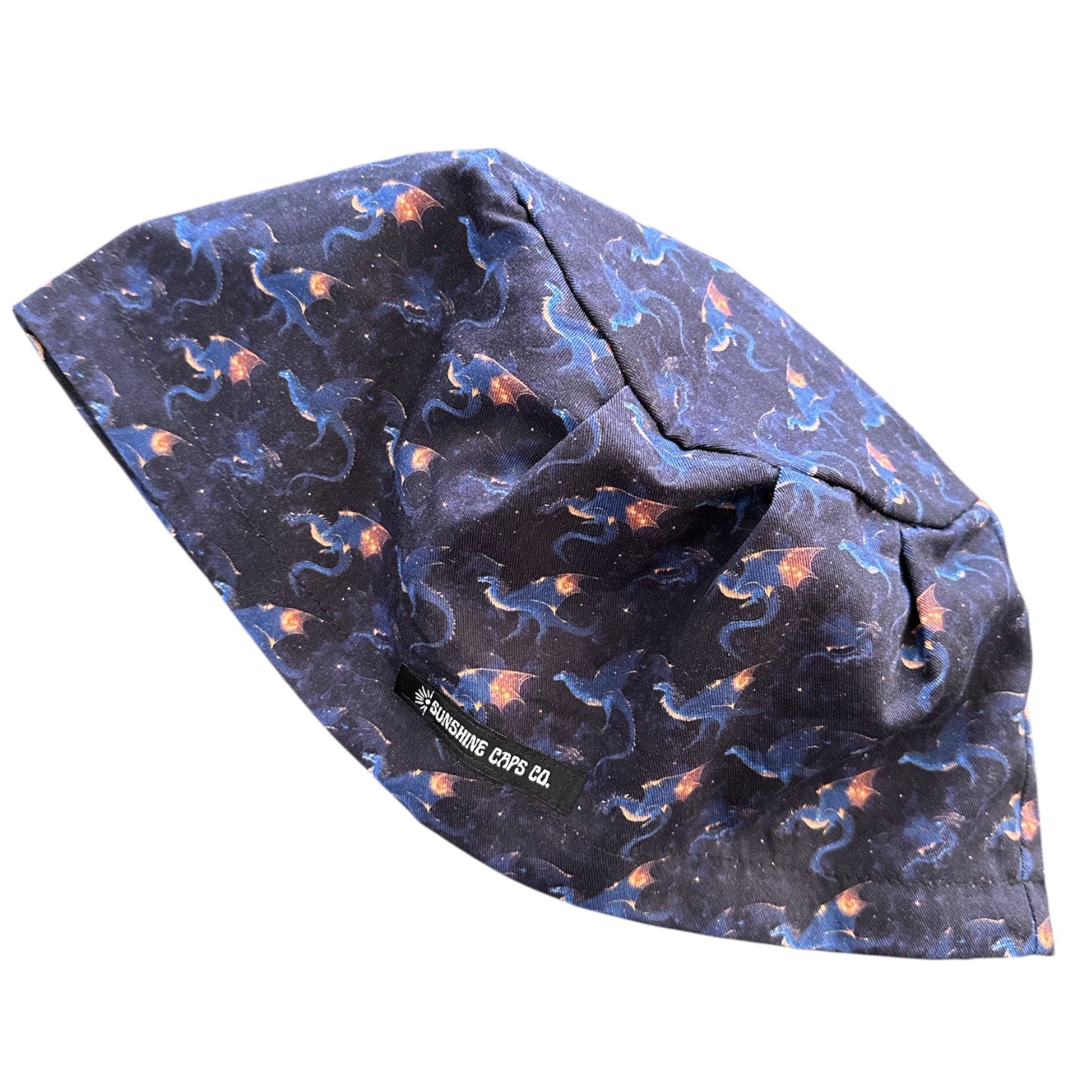 Designed with a sleek, tailored euro silhouette, this cap sits smoothly around the head while offering subtle fullness through a refined back pleat for comfort and movement. The dramatic dragon print set against a deep midnight backdrop creates a look that feels strong, confident, and undeniably eye-catching — perfect for healthcare professionals who like their style to stand out.