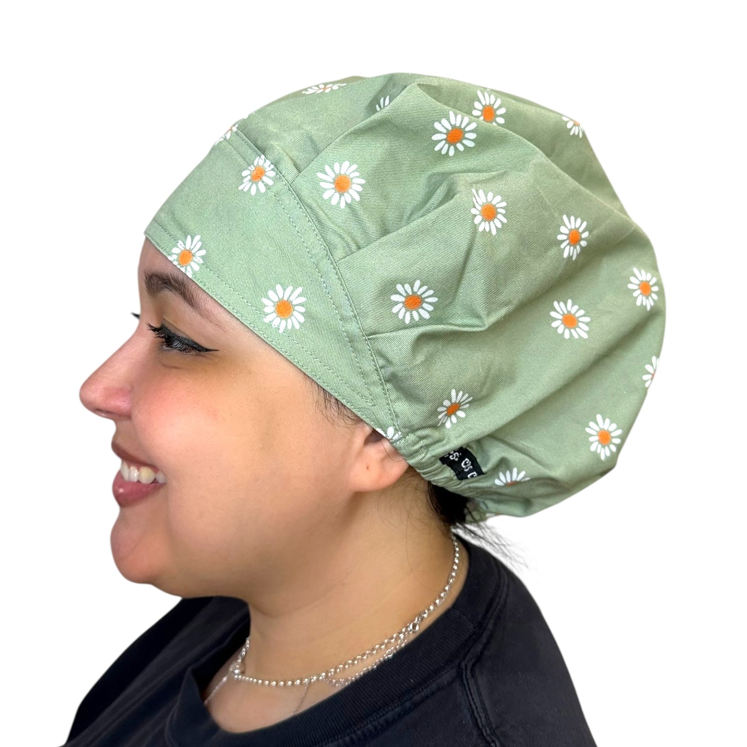 Bouffant: A full coverage surgical cap for almost any length of hair. Wide sweatband across the front that tapers to the sides. Adjustable elastic cord-lock in back. 100% Cotton. Available with a satin-lined interior to protect your hair against frizz & breakage.