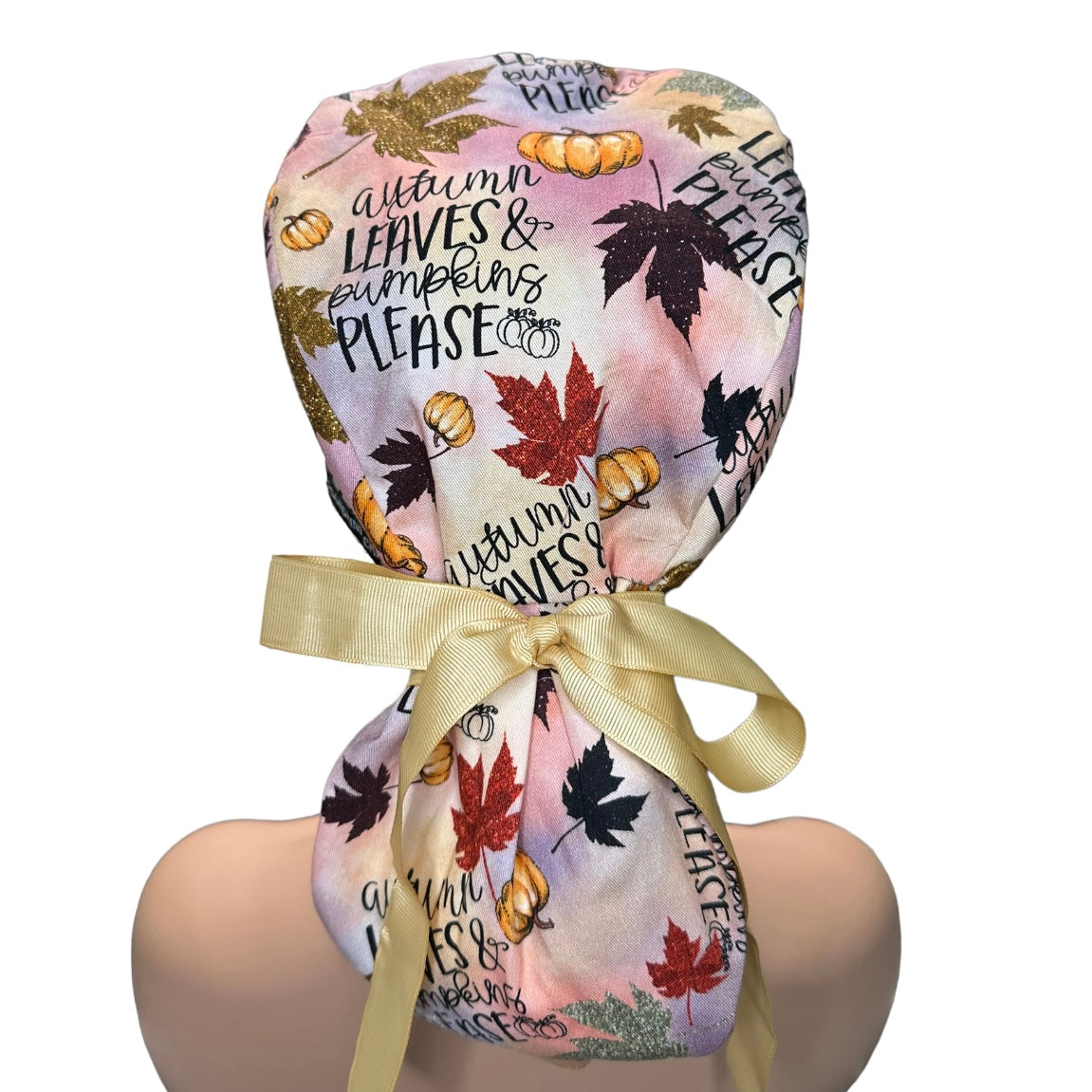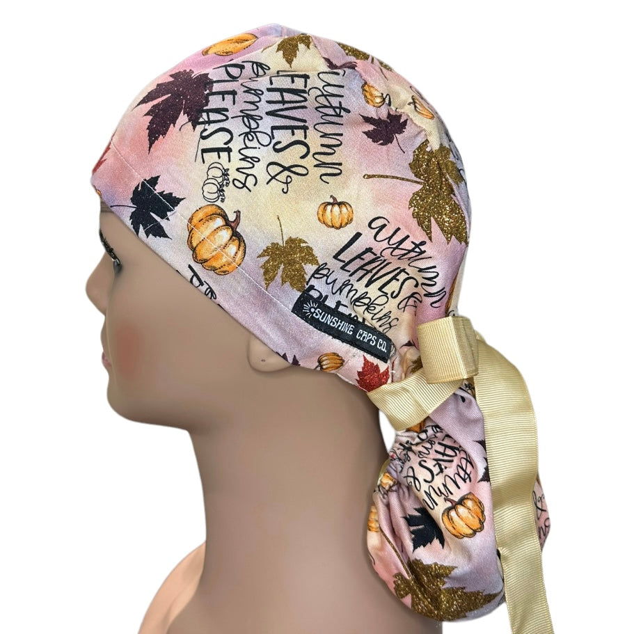 Autumn Leaves and Pumpkins Please Ponytail Scrub Cap