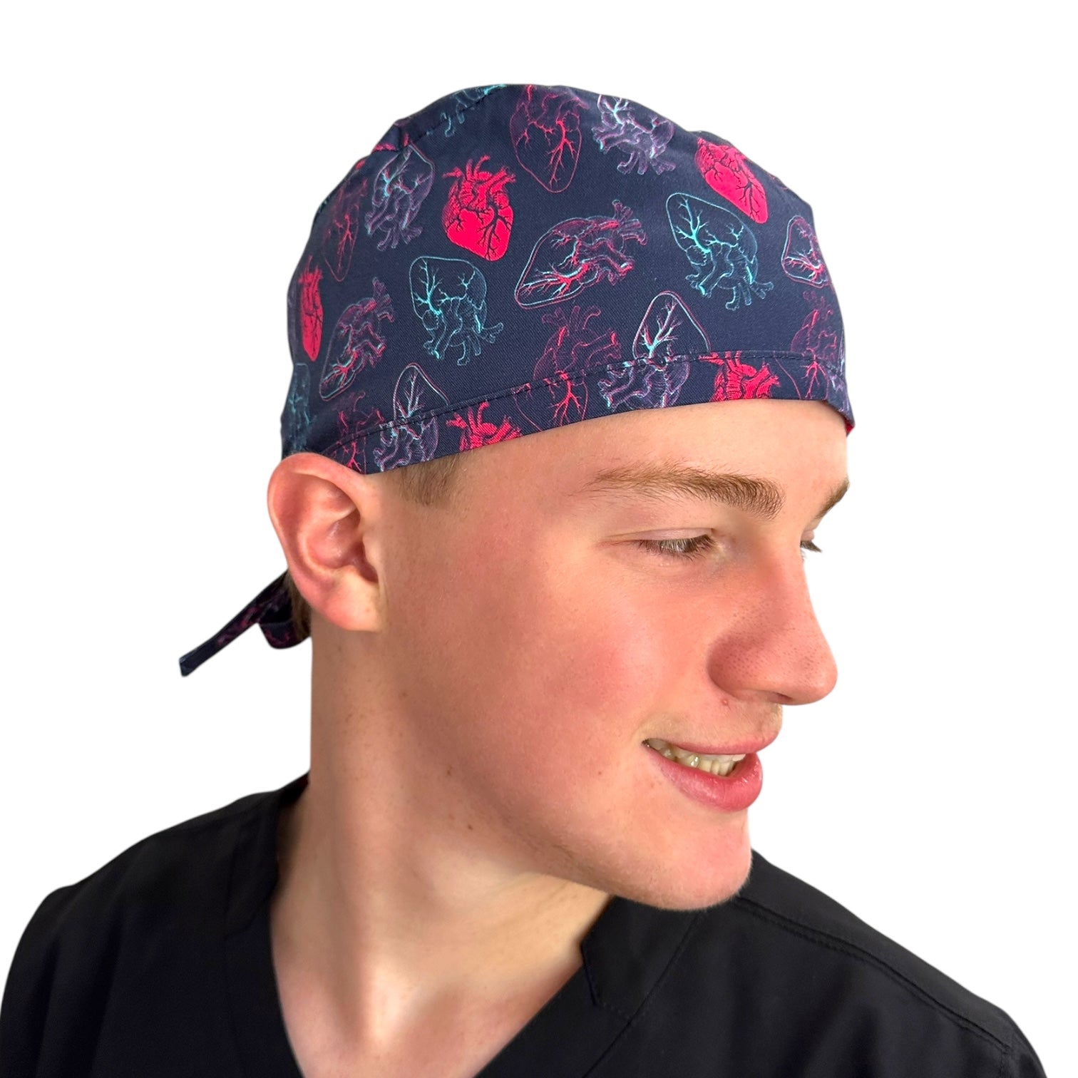 Tie-Back: A unisex surgical scrub cap that offers a little more room than our classic cap. Short-medium length hair can be tucked in for full coverage or worn out the back. It can be flipped along the edge, or left unfolded. A sweatband runs along the forehead. 100% Cotton