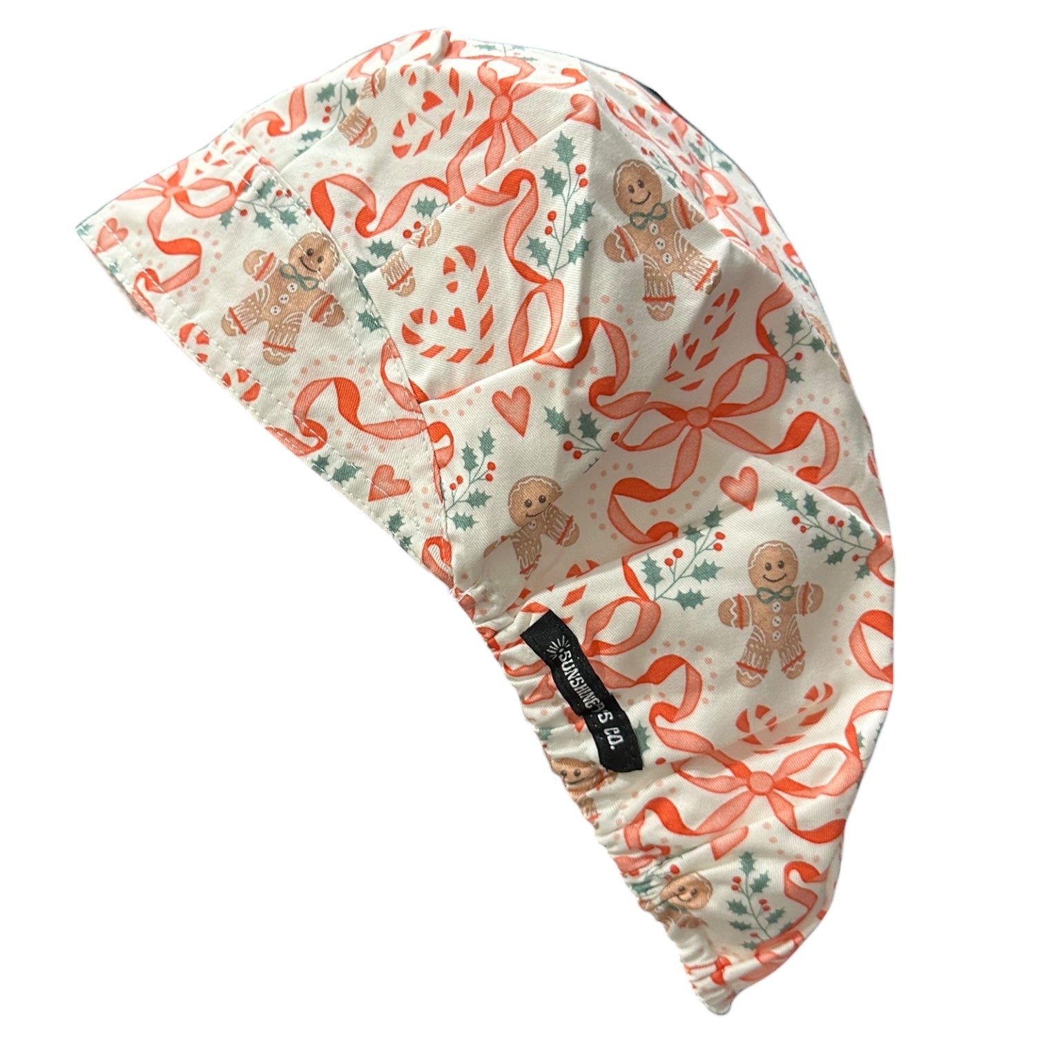 Sweet, soft, and full of holiday cheer — our Gingerbread Bows bouffant scrub cap is the perfect way to celebrate the season at work! Featuring gingerbread cookies, holly sprigs, candy canes, and dainty pink ribbons, this festive print brings cozy Christmas charm to every shift.