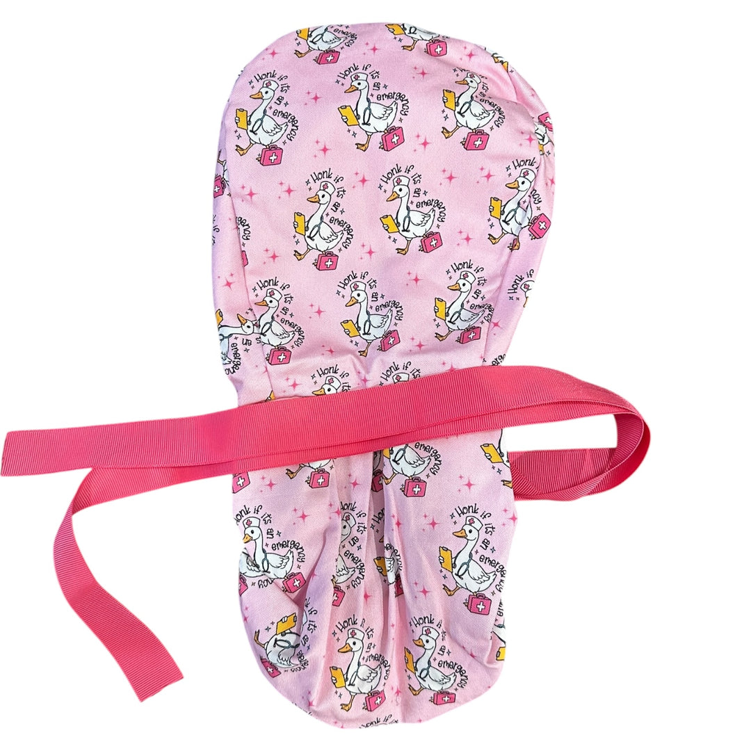 Bouffant: A full coverage surgical cap for almost any length of hair. Wide sweatband across the front that tapers to the sides. Adjustable elastic cord-lock in back. 100% Cotton. Available with a satin-lined interior to protect your hair against frizz & breakage.