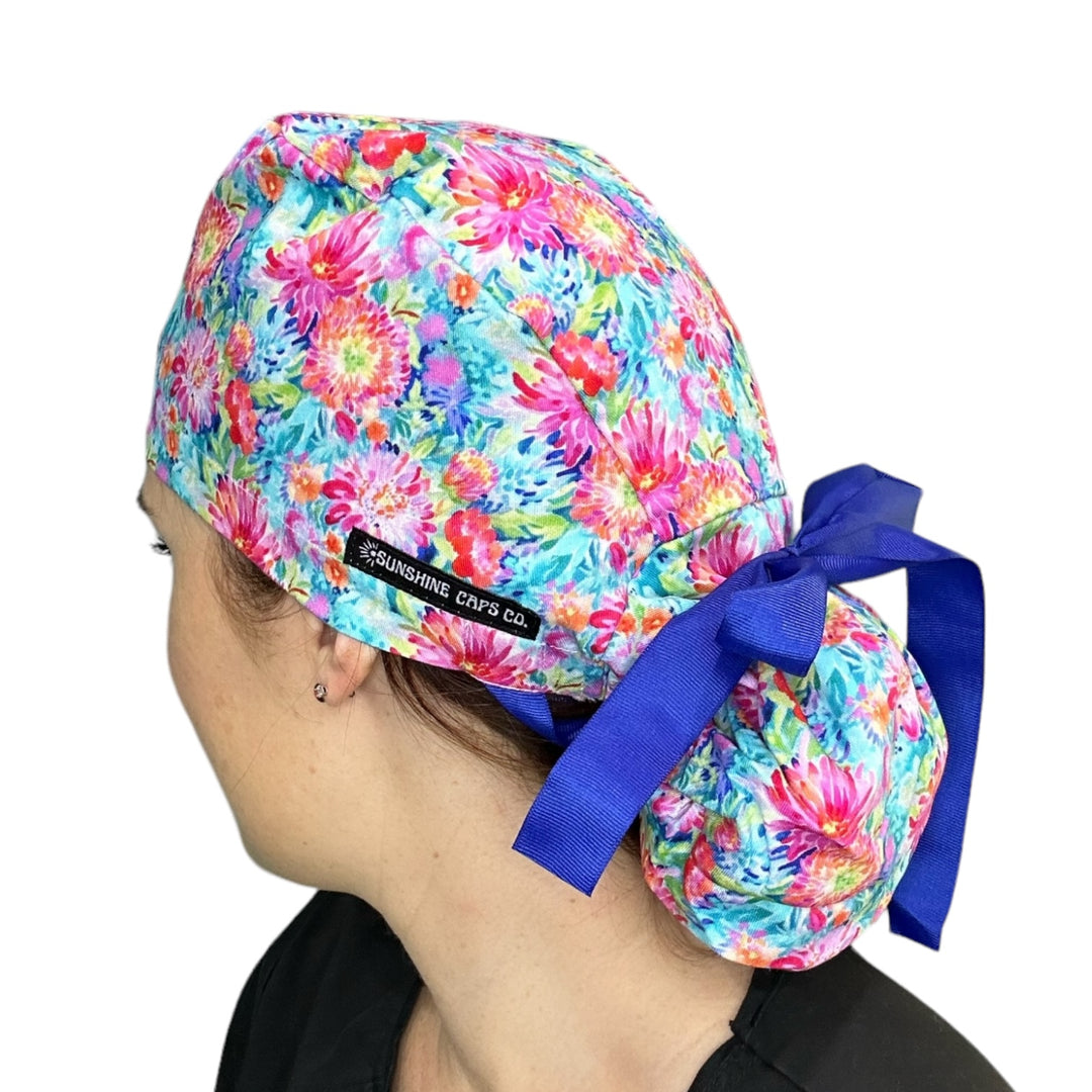 Bright Floral Ponytail Scrub Cap for Women, By Sunshine Caps Co.