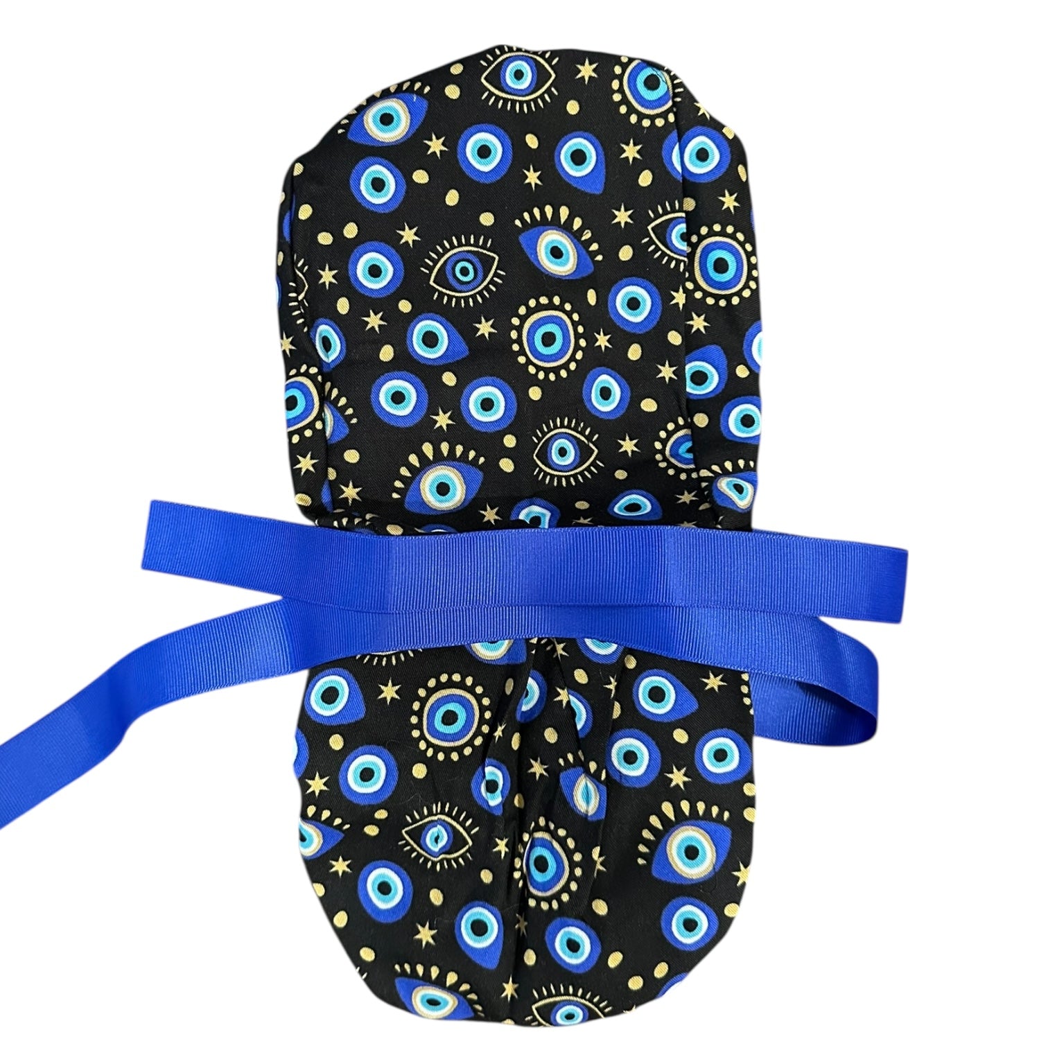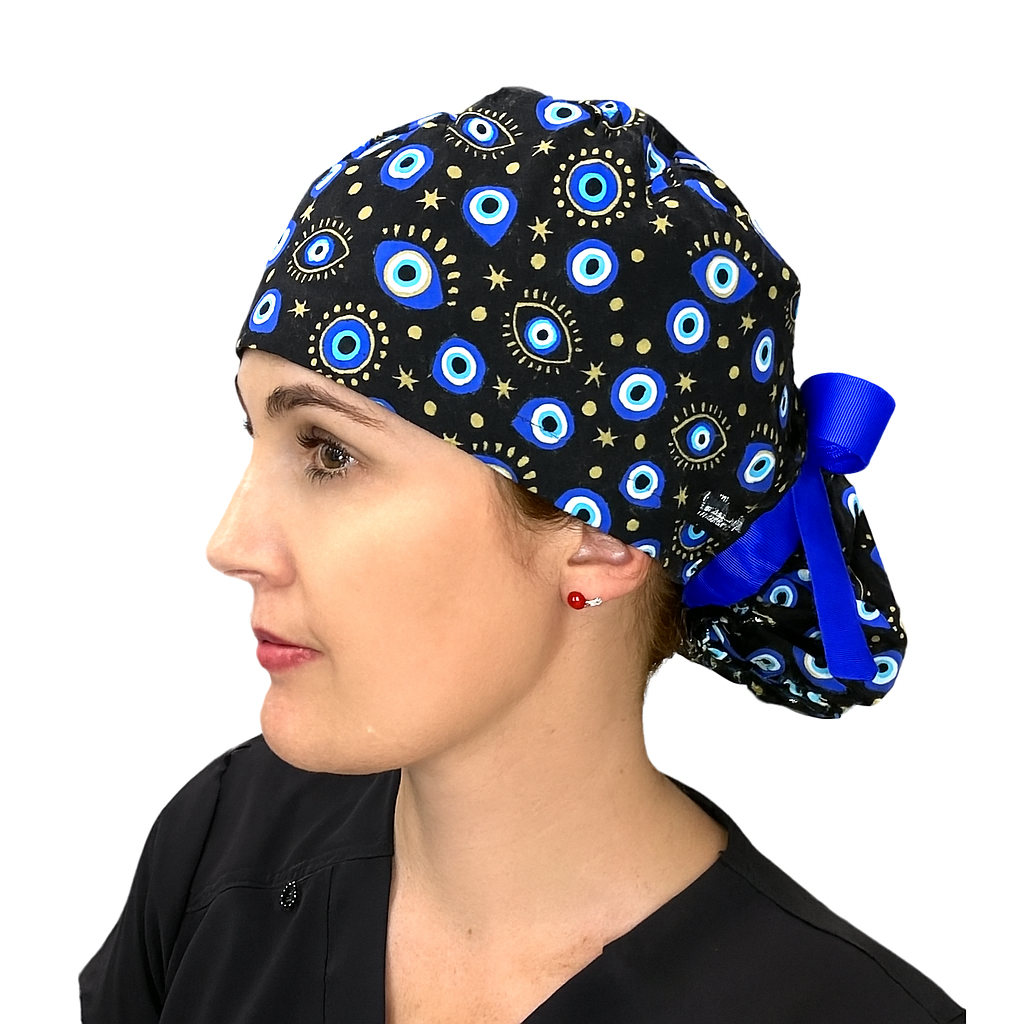 Our Evil Eyes on Black ponytail scrub cap is made from high-quality, lightweight material that is both breathable and comfortable to wear for long hours. The design features a vibrant royal blue and gold evil eyes on a black background, offering protection throughout your work day!