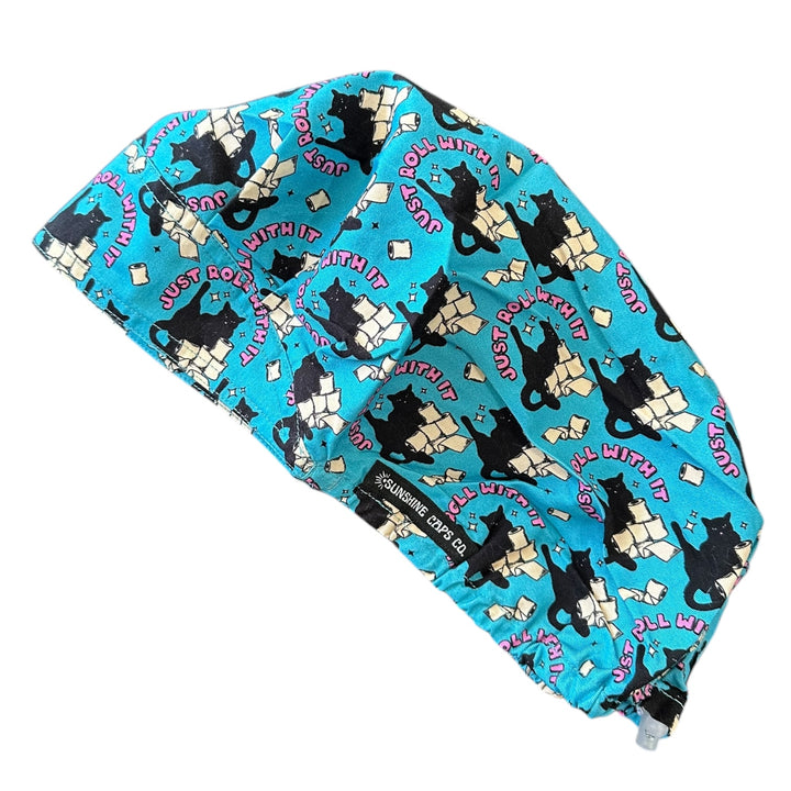 Our "Roll with it" Funny Cat Bouffant Scrub Cap is made from high-quality, durable fabric, this scrub cap is designed to withstand the rigors of daily use in medical settings. The bouffant style design provides ample space for longer hair and ensures a comfortable fit throughout the workday. The cap features an adjustable elastic band and cord-lock that ensures a secure fit for a wide range of head sizes.
