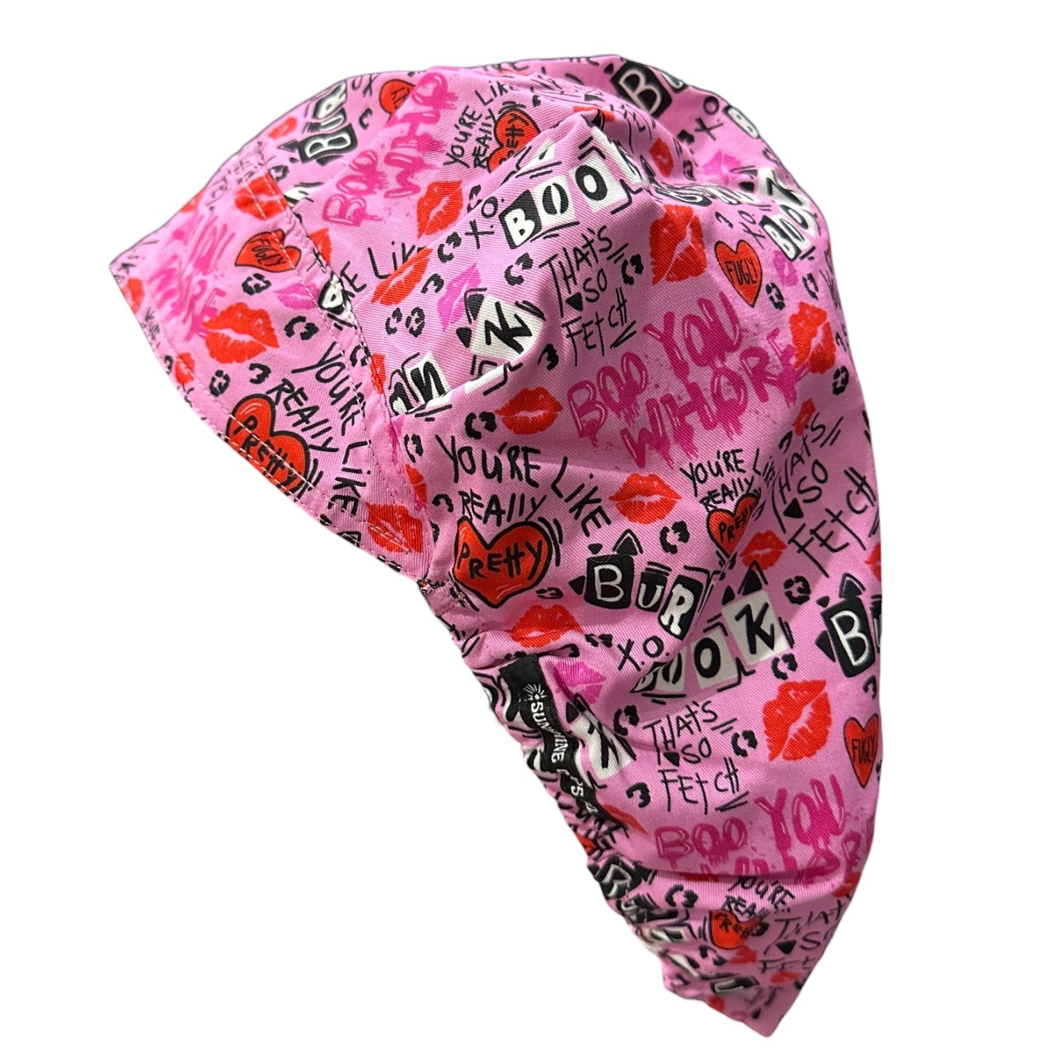 Our Burn Book Bouffant Scrub Cap brings the perfect mix of playful and professional. With bold lips and doodles on soft pink cotton, it’s roomy enough for all hair types — from curls to buns — and features an adjustable toggle for a secure, comfortable fit.